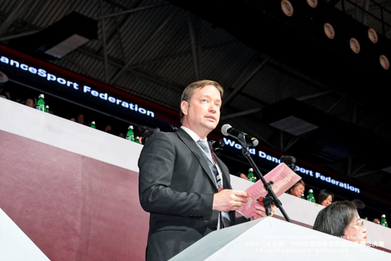 世界体育舞蹈联合会秘书长谢尔盖·尼芬托夫先生随后登台致辞。他高度评价中国特别是上海在推动体育舞蹈全球化发展中的关键作用,并盛赞“永业杯”已成为WDSF体系中最具影响力的品牌赛事之一。今晚,不仅是见证比赛的开始,更是见证友谊、尊重与卓越的共舞。
